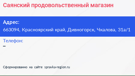 Саянский, продовольственный магазин по адресу 663094, Красноярский край, Дивногорск, Чкалова, 31а/1 в дальнейшем Организация, размещена в следующих категориях:
