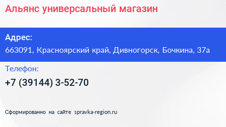 Альянс, универсальный магазин по адресу 663091, Красноярский край, Дивногорск, Бочкина, 37а в дальнейшем Организация, размещена в следующих категориях: