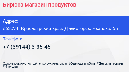 Бирюса, магазин продуктов по адресу 663094, Красноярский край, Дивногорск, Чкалова, 5Б в дальнейшем Организация, размещена в следующих категориях: