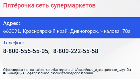 Пятёрочка, сеть супермаркетов по адресу 663091, Красноярский край, Дивногорск, Чкалова, 78а в дальнейшем Организация, размещена в следующих категориях: