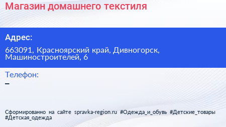 Магазин домашнего текстиля по адресу 663091, Красноярский край, Дивногорск, Машиностроителей, 6 в дальнейшем Организация, размещена в следующих категориях:
