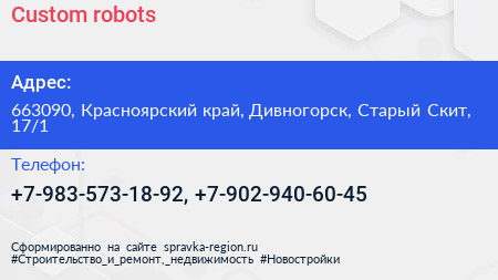 Custom robots по адресу 663090, Красноярский край, Дивногорск, Старый Скит, 17/1 в дальнейшем Организация, размещена в следующих категориях: