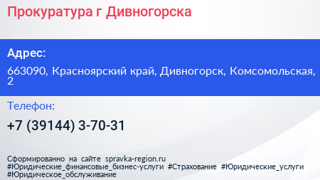 Прокуратура г. Дивногорска по адресу 663090, Красноярский край, Дивногорск, Комсомольская, 2 в дальнейшем Организация, размещена в следующих категориях: