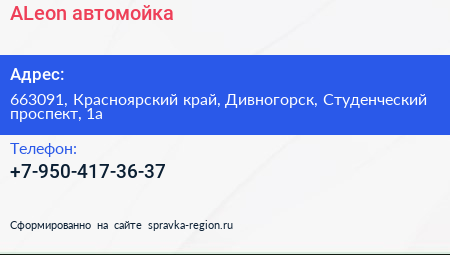 ALeon, автомойка по адресу 663091, Красноярский край, Дивногорск, Студенческий проспект, 1а в дальнейшем Организация, размещена в следующих категориях: