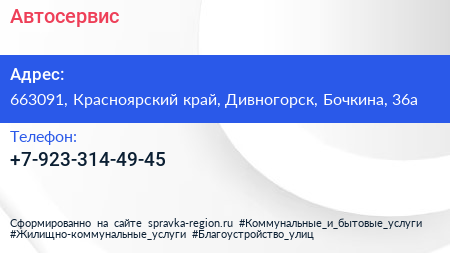 Автосервис по адресу 663091, Красноярский край, Дивногорск, Бочкина, 36а в дальнейшем Организация, размещена в следующих категориях: