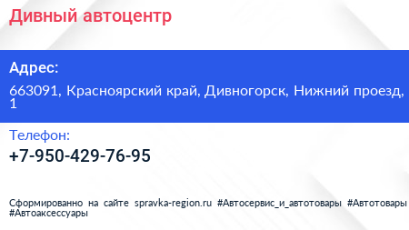 Дивный, автоцентр по адресу 663091, Красноярский край, Дивногорск, Нижний проезд, 1 в дальнейшем Организация, размещена в следующих категориях: