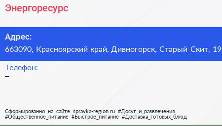 Энергоресурс по адресу 663090, Красноярский край, Дивногорск, Старый Скит, 19 в дальнейшем Организация, размещена в следующих категориях: