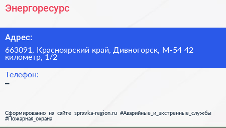 Энергоресурс по адресу 663091, Красноярский край, Дивногорск, М-54 42 километр, 1/2 в дальнейшем Организация, размещена в следующих категориях: