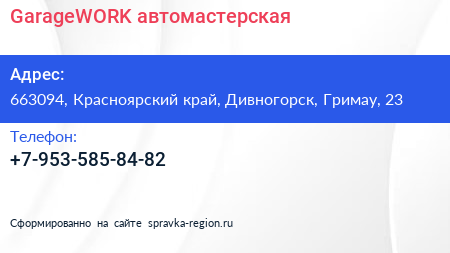 GarageWORK, автомастерская по адресу 663094, Красноярский край, Дивногорск, Гримау, 23 в дальнейшем Организация, размещена в следующих категориях: