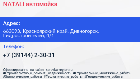 NATALI, автомойка по адресу 663093, Красноярский край, Дивногорск, Гидростроителей, 4/1 в дальнейшем Организация, размещена в следующих категориях: