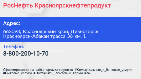 РосНефть-Красноярскнефтепродукт по адресу 663093, Красноярский край, Дивногорск, Красноярск-Абакан трасса 36 км, 1 в дальнейшем Организация, размещена в следующих категориях: