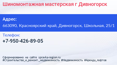 Шиномонтажная мастерская, г. Дивногорск по адресу 663090, Красноярский край, Дивногорск, Школьная, 25/1 в дальнейшем Организация, размещена в следующих категориях: