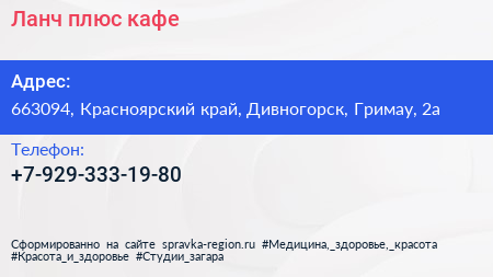 Ланч плюс, кафе по адресу 663094, Красноярский край, Дивногорск, Гримау, 2а в дальнейшем Организация, размещена в следующих категориях: