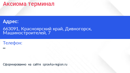 Аксиома, терминал по адресу 663091, Красноярский край, Дивногорск, Машиностроителей, 7 в дальнейшем Организация, размещена в следующих категориях: