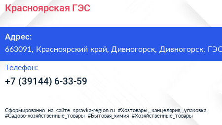 Красноярская ГЭС по адресу 663091, Красноярский край, Дивногорск, Дивногорск, ГЭС в дальнейшем Организация, размещена в следующих категориях: