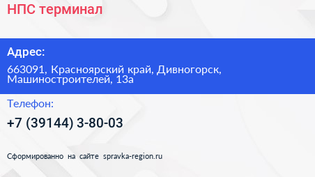 НПС, терминал по адресу 663091, Красноярский край, Дивногорск, Машиностроителей, 13а в дальнейшем Организация, размещена в следующих категориях:
