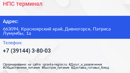 НПС, терминал по адресу 663094, Красноярский край, Дивногорск, Патриса Лумумбы, 1а в дальнейшем Организация, размещена в следующих категориях:
