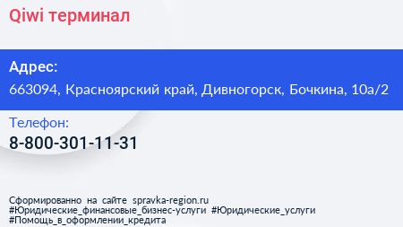Qiwi, терминал по адресу 663094, Красноярский край, Дивногорск, Бочкина, 10а/2 в дальнейшем Организация, размещена в следующих категориях: