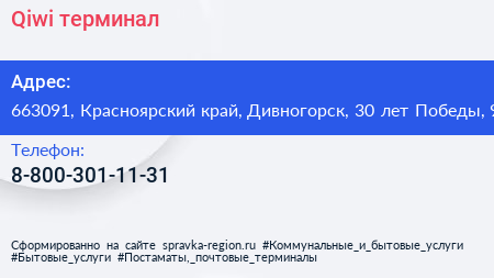 Qiwi, терминал по адресу 663091, Красноярский край, Дивногорск, 30 лет Победы, 9 в дальнейшем Организация, размещена в следующих категориях: