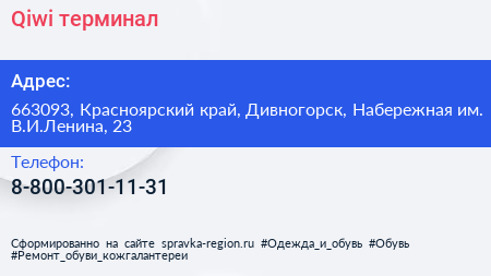 Qiwi, терминал по адресу 663093, Красноярский край, Дивногорск, Набережная им. В.И.Ленина, 23 в дальнейшем Организация, размещена в следующих категориях:
