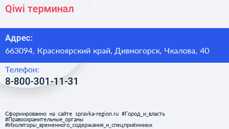 Qiwi, терминал по адресу 663094, Красноярский край, Дивногорск, Чкалова, 40 в дальнейшем Организация, размещена в следующих категориях: