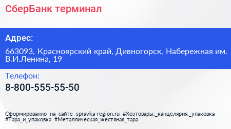 СберБанк, терминал по адресу 663093, Красноярский край, Дивногорск, Набережная им. В.И.Ленина, 19 в дальнейшем Организация, размещена в следующих категориях: