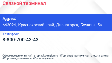 Связной, терминал по адресу 663094, Красноярский край, Дивногорск, Бочкина, 5а в дальнейшем Организация, размещена в следующих категориях:
