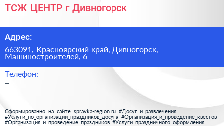 ТСЖ ЦЕНТР, г. Дивногорск по адресу 663091, Красноярский край, Дивногорск, Машиностроителей, 6 в дальнейшем Организация, размещена в следующих категориях: