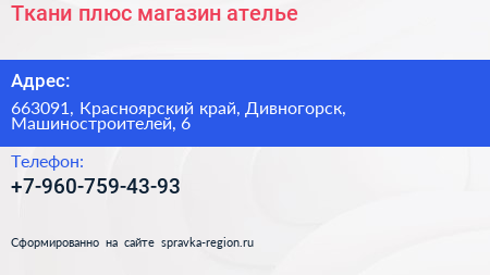 Ткани плюс, магазин-ателье по адресу 663091, Красноярский край, Дивногорск, Машиностроителей, 6 в дальнейшем Организация, размещена в следующих категориях: