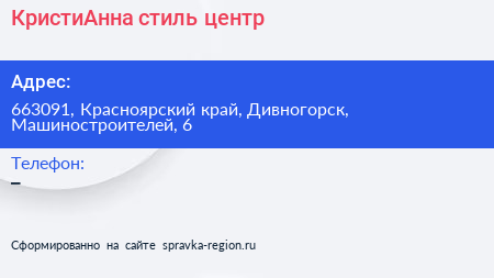 КристиАнна, стиль-центр по адресу 663091, Красноярский край, Дивногорск, Машиностроителей, 6 в дальнейшем Организация, размещена в следующих категориях: