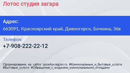 Лотос, студия загара по адресу 663091, Красноярский край, Дивногорск, Бочкина, 36в в дальнейшем Организация, размещена в следующих категориях: