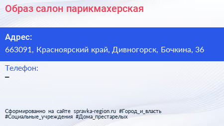 Образ, салон-парикмахерская по адресу 663091, Красноярский край, Дивногорск, Бочкина, 36 в дальнейшем Организация, размещена в следующих категориях: