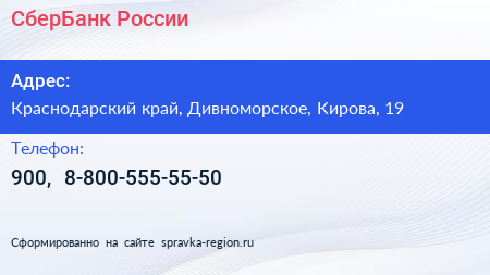 СберБанк России по адресу Краснодарский край, Дивноморское, Кирова, 19 в дальнейшем Организация, размещена в следующих категориях: