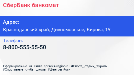 СберБанк, банкомат по адресу Краснодарский край, Дивноморское, Кирова, 19 в дальнейшем Организация, размещена в следующих категориях: