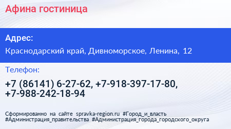Афина, гостиница по адресу Краснодарский край, Дивноморское, Ленина, 12 в дальнейшем Организация, размещена в следующих категориях: