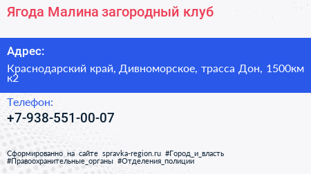 Ягода Малина, загородный клуб по адресу Краснодарский край, Дивноморское, трасса Дон, 1500км к2 в дальнейшем Организация, размещена в следующих категориях: