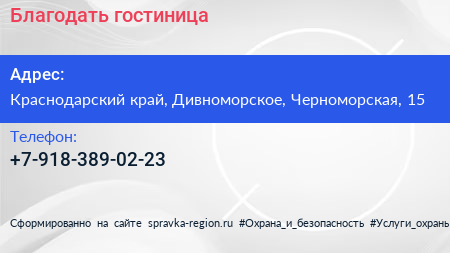 Благодать, гостиница по адресу Краснодарский край, Дивноморское, Черноморская, 15 в дальнейшем Организация, размещена в следующих категориях: