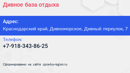 Дивное, база отдыха по адресу Краснодарский край, Дивноморское, Дивный переулок, 7 в дальнейшем Организация, размещена в следующих категориях: