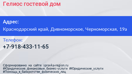Гелиос, гостевой дом по адресу Краснодарский край, Дивноморское, Черноморская, 19а в дальнейшем Организация, размещена в следующих категориях: