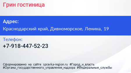 Грин, гостиница по адресу Краснодарский край, Дивноморское, Ленина, 19 в дальнейшем Организация, размещена в следующих категориях: