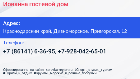 Иованна, гостевой дом по адресу Краснодарский край, Дивноморское, Приморская, 12 в дальнейшем Организация, размещена в следующих категориях: