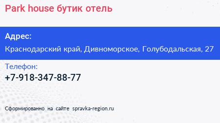 Park-house, бутик-отель по адресу Краснодарский край, Дивноморское, Голубодальская, 27 в дальнейшем Организация, размещена в следующих категориях: