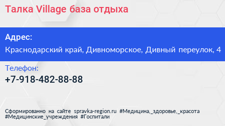 Талка Village, база отдыха по адресу Краснодарский край, Дивноморское, Дивный переулок, 4 в дальнейшем Организация, размещена в следующих категориях: