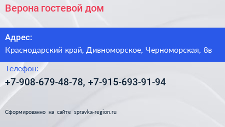 Верона, гостевой дом по адресу Краснодарский край, Дивноморское, Черноморская, 8в в дальнейшем Организация, размещена в следующих категориях: