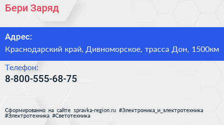 Бери Заряд по адресу Краснодарский край, Дивноморское, трасса Дон, 1500км в дальнейшем Организация, размещена в следующих категориях: