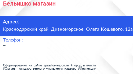 Бельишко, магазин по адресу Краснодарский край, Дивноморское, Олега Кошевого, 12а в дальнейшем Организация, размещена в следующих категориях: