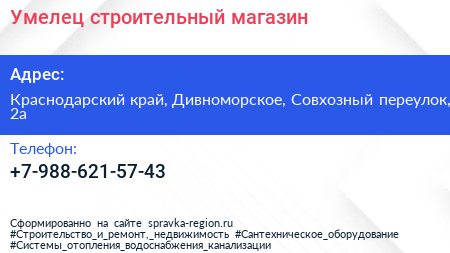 Умелец, строительный магазин по адресу Краснодарский край, Дивноморское, Совхозный переулок, 2а в дальнейшем Организация, размещена в следующих категориях: