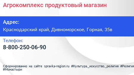 Агрокомплекс, продуктовый магазин по адресу Краснодарский край, Дивноморское, Горная, 35в в дальнейшем Организация, размещена в следующих категориях: