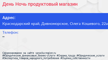 День-Ночь, продуктовый магазин по адресу Краснодарский край, Дивноморское, Олега Кошевого, 22а в дальнейшем Организация, размещена в следующих категориях: