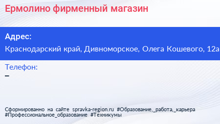 Ермолино, фирменный магазин по адресу Краснодарский край, Дивноморское, Олега Кошевого, 12а в дальнейшем Организация, размещена в следующих категориях: